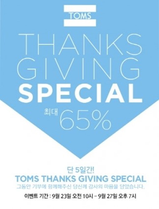 탐스는 23일부터 오는 27일까지 ‘추수감사절 스페셜’(THANKS GIVING SPECIAL)로 최대 65%까지 할인되는 이벤트를 실시한다.