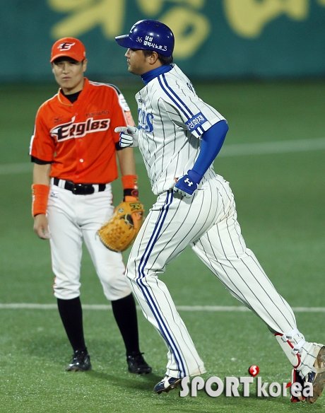 23일 오후 대구 시민야구장에서 열린 ‘2013 한국 야쿠르트 세븐 프로야구’ 삼성 라이온즈와 한화 이글스의 경기 4회말 1사 1루 상황에서 삼성 채태인이 역전 투런포를 쏘아올린 후 그라운드를 돌고 있다.