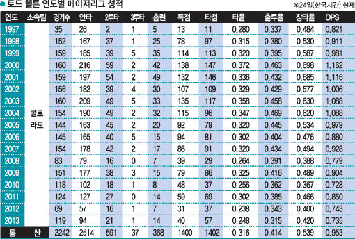 23번은 ‘농구황제’ 마이클 조던의 등번호로 팬들의 기억 속에 남아있다. 그러나 콜로라도에선 17번이 23번 못지않게 많은 팬들의 사랑을 받는 등번호다. 주인공은 바로 콜로라도 로키스의 1루수 토드 헬튼(40)이다. 16일(한국시간) 헬튼은 올 시즌을 끝으로 은퇴하겠다는 뜻을 밝혔다. 1995년 신인 드래프트에서 전체 8번으로 로키스에 지명된 헬튼은 공교롭게도 자신의 등번호처럼 한 팀에서만 17년째 빅리거로 활약하고 있다. 그의 마지막 홈경기는 26일 보스턴 레드삭스전이며, 선수생활의 피날레는 30일 LA 다저스와의 원정경기로 장식하게 된다. 메이저리그 통산 성적은 23일 현재 타율 0.316, 368홈런, 1402타점, 1400득점, 출루율 0.414, 장타율 0.539다. 2000년부터 5년 연속 내셔널리그 올스타에 선정됐고, 골드글러브도 3차례 수상했다.