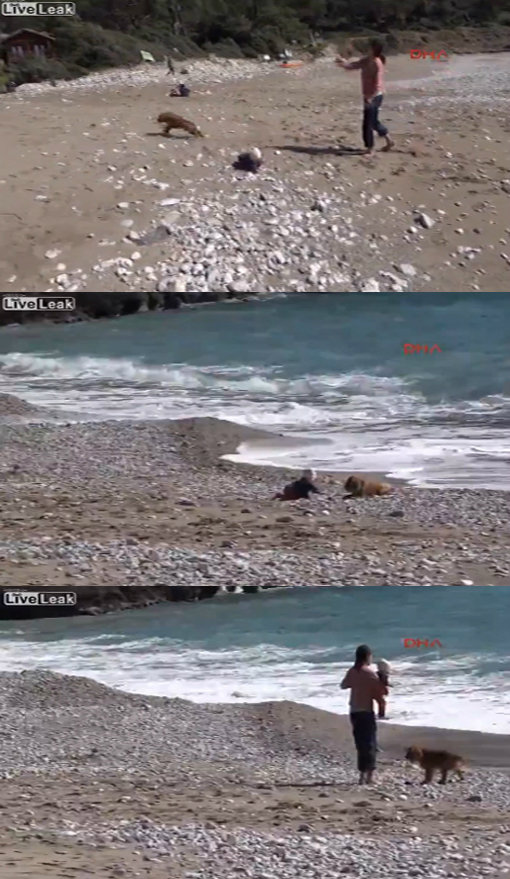 아이의 엄마가 이 사실을 알지 못한 사이 개가 알아차리고는 아기 앞으로 달려갔다. 개는 바로 뒤에서 거센 파도가 치는데도 불구하고 아기를 향해 짓기 시작했다.