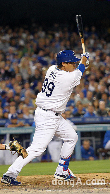 상대 선발 맷 케인을 상대로 3회 중견수 뜬공, 5회 헛스윙 삼진으로 물러난 류현진은 7회 케인의 5구째를 공략, 중전 안타를 때려내며 1루를 밟았다. 그러나 류현진은 후속 야시엘 푸이그의 타석 때 포수 버스터 포지의 견제구에 걸려 아웃돼 아쉬움을 남겼다.