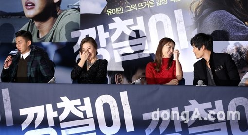 배우 유아인, 김해숙, 정유미, 김성오(왼쪽부터)가 25일 오후 서울 왕십리 CGV에서 열린 영화 ‘깡철이’ 언론배급시사회에서 참석해 취재진의 질문에 답변을 하고 있다. 동명소설을 원작으로. 한 영화 ‘깡철이’는 치매를 앓고 있는 엄마와 남편처럼 든든하게 지내는 아들 깡철이의 이야기다. 영화는 내달 2일 개봉.