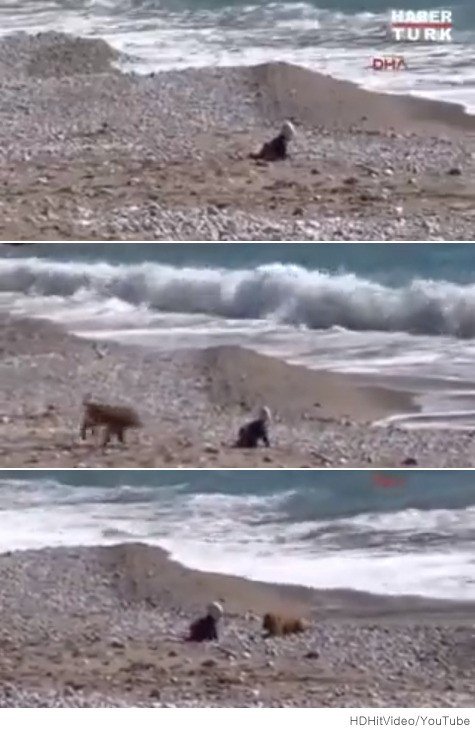 아이의 엄마가 이 사실을 알지 못한 동안 이 개가 먼저 알아차리고 아기 앞으로 달려갔다. 개는 바로 뒤에서 거센 파도가 치는데도 불구하고 아기를 향해 짓기 시작했다.