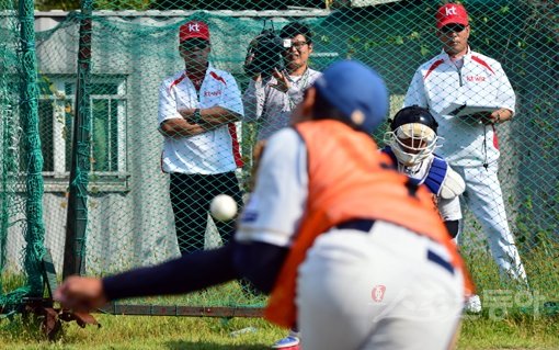 프로 출신 선수들은 자신의 청춘을 담았던 유니폼을 입었다. 드문드문 사회인 야구팀의 모자를 쓴 선수도 있었다. 유니폼과 모자는 제각각. 그러나 프로선수가 되기 위한 열정만큼은 하나였다. 25일 수원 성균관대 야구장에선 제10구단 KT의 공개 트라이아웃이 열렸다.