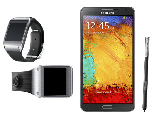 삼성전자가 국내에 새 스마트 디바이스 제품군을 출시했다. 특히 삼성의 첫 ‘입는(웨어러블) 컴퓨터’인 스마트워치 제품을 선보여 눈길을 끌었다. 삼성전자는 25일 서울 서초사옥 다목적홀에서 ‘갤럭시노트3 월드투어 2013, 서울’ 행사를 열고 대화면 스마트폰 ‘갤럭시노트3(사진 오른쪽)’와 스마트워치 ‘갤럭시 기어’를 공개했다. 이들 제품은 25일 국내 통신사를 통해 출시됐다.