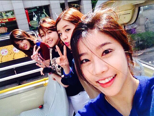 사진에는 소진이 걸스데이 동료 혜리, 민아, 유라와 함께 2층버스에 나란히 앉아 셀카를 찍고 있는 모습이 담겨 있다.