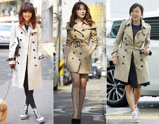 가을은 트렌치코트의 계절이다. 전도연(맨 오른쪽)은 트렌트 코트에 운동화를 신어 소탈한 매력을 뽐냈고, 이효리(맨 왼쪽)와 윤은혜(가운데)는 각각 스키니진, 미니스커트를 매치해 섹시한 매력을 뽐냈다. 트렌치코트는 다양한 스타일링을 만들어주는 유용한 패션 아이템이다. 사진제공|버버리