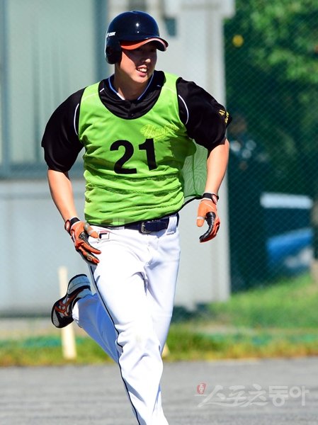 26일 수원 원광대학교 야구장에서 프로야구 10구단 KT의 공개 트라이아웃 홍백평가전이 열렸다. 군인 신분으로 트라이아웃에 참가 한 B팀 백경도가 안타를 치고 나가고 있다. 수원ㅣ박화용 기자 inphoto@donga.com 트위터 @seven7sola