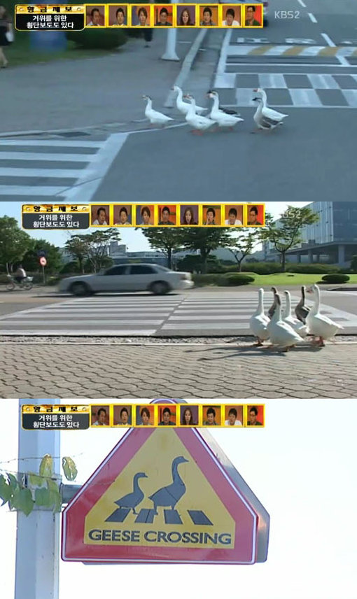 사진은 지난 2011년 10월 방송된 KBS 2TV ‘스펀지 제로’ 화면을 캡처한 것으로 거위들이 횡단보도를 건너고 있다. 교통표지판에는 ‘거위 횡단보도’(Geese Crossing)라고 써 있다.