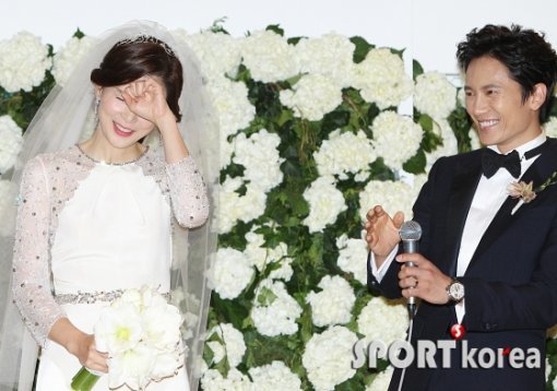 배우 지성-이보영이 27일 오후 서울 워커힐 호텔에서 결혼식을 올리기 전 기자회견을 열고 닭살 애정을 과시하고 있다.
