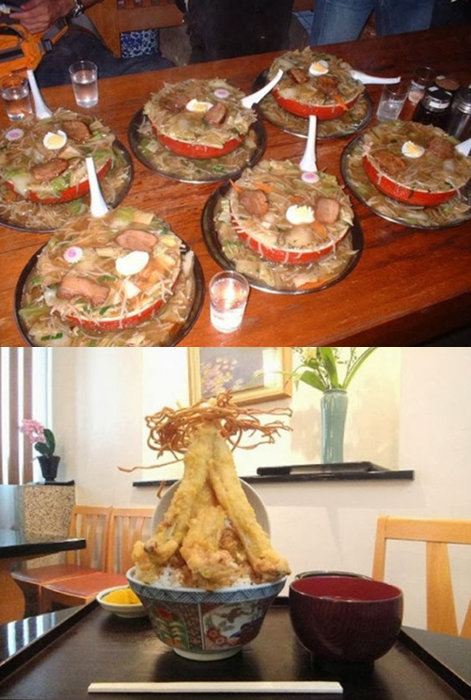 처음 사진은 국물이 흘러 넘칠 정도의 많은 양의 라멘을 볼 수 있고, 튀김이 산처럼 쌓여있는 덮밥도 볼 수 있다. 보는 것만으로도 포만감이 느껴질 정도.