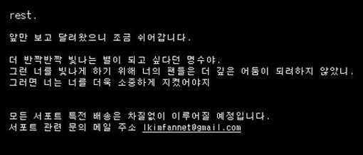 엘의 팬페이지 ‘애정의 주인’ 홈페이지 메인 화면에는 “앞만 보고 달려왔으니 조금 쉬어갑니다. 더 반짝반짝 빛나는 별이 되고 싶다던 명수야. 그런 너를 빛나게 하기 위해 너의 팬들은 더 깊은 어둠이 되려하지 않았니. 그러면 너는 너를 더욱 소중하게 지켰어야지”라는 문구와 함께 임시 폐쇄했다.