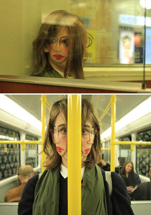 또 여성 모델의 한쪽 눈을 활용해 양쪽 뺨에 두 개의 얼굴을 그리는가 하면, 모델의 앞 머리카락을 가운데로 길게 늘어뜨려 얼굴을 둘로 나누기도 했다.