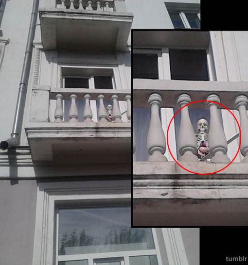 최근 해외 온라인 커뮤니티를 중심으로 공개된 이 사진은 베란다에 놓인 해골 모습이 담겨 있다.