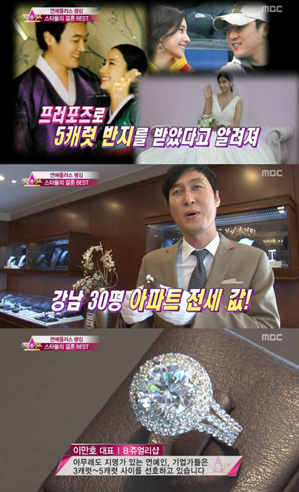 특히 한채영은 결혼 선물로 5캐럿 반지와 외제차를 받아 눈길을 끌었다. 전문가는 한채영이 받은 결혼반지는 “강남 30평 아파트 전셋값”이라고 말해 놀라움을 자아냈다.
