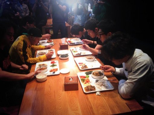 지드래곤은 29일 자신의 트위터를 통해 MBC '무한도전' 촬영 당시 찍은 사진을 올렸다. 사진 속에는 가수 하하와 밴드 장기하와 얼굴들이 YG 구내식당에서 식사를 하는 모습이 담겨 있다.