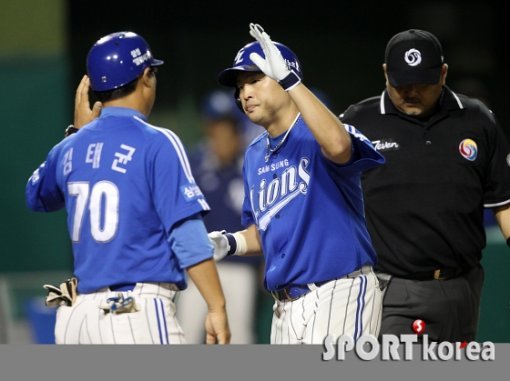 30일 오후 대전 한밭야구장에서 열린 ‘2013 한국야쿠르트 세븐 프로야구’ 한화 이글스와 삼성 라이온즈의 경기에서 삼성 7회초 1사 1,2루 때 2번 박한이가 비거리125m 우중월 스리런홈런을 치고 홈인하며 김태균 코치의 환영을 받고 있다.