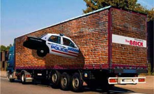 공개된 사진에는 대형 트렐일러 에 경찰차가 충돌하는 모습이 담겨 있따. 그러나 사진을 자세히 보면 이는 트레일러에 그려진 이미지임을 알 수 있다.