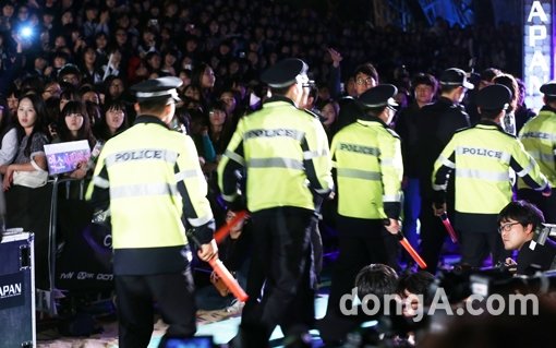 4일 오후 부산 해운대 비프빌리지 야외무대에서 APAN 스타로드 행사에 경찰들이 안전펜스 설차하기 위해 투입되고 있다. 이번 행사는 한국관광공사와 한국연예매니지먼트협회가 공동개최한다.