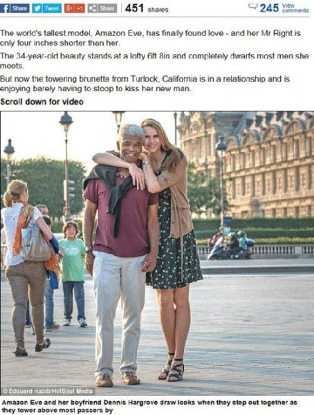 미국 캘리포니아 출신의 신장 203cm의 세계 최장신 모델 아마존 이브(34)가 60대 남성과 연애 중이라고 알려져 눈길을 끌고 있다.
