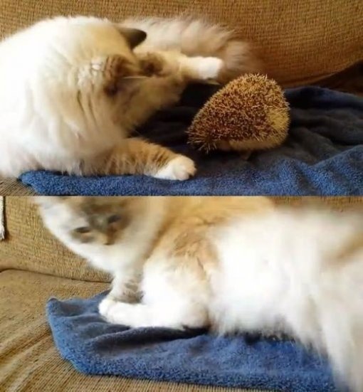 ‘고슴도치 위에 앉은 고양이’ 영상이 화제다.