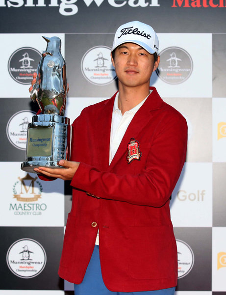 김도훈이 6일 국내 남자골프 유일의 매치플레이 경기인 먼싱웨어 챔피언십에서 연장 접전 끝에 우승한 후 우승컵을 들고 포즈를 취하고 있다. 사진제공|KPGA
