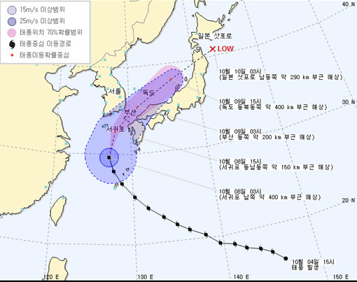 이후 9일 오전 중급 소형 태풍으로 세력이 약해져 부산 동쪽 약 200km 부근 해상으로 북동진한 뒤 9일 오후 독도 동북동쪽 해상으로 빠져나갈 것으로 전망된다.