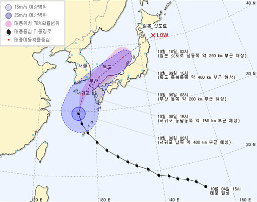 9일 오전에는 중급 소형 태풍으로 세력이 약해져 부산 동쪽 약 200km 부근 해상으로 북동진한 뒤 9일 오후 독도 동북동쪽 해상으로 빠져나갈 것으로 관측된다.