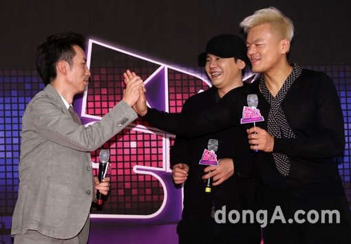 가수 유희열, 양현석, 박진영(왼쪽부터)가 8일 오후 서울 양천구 41타워에서 열린 ‘서바이벌 오디션 K팝스타 시즌3’ 기자간담회에 참석해 담소를 나누고 있다.