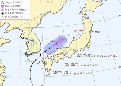 기상청의 관측에 따르면 9일 현재 다나스는 독도 남남서쪽 180km 부근 해상까지 진출했다. 매시 40km의 빠른 속도로 동북 동진하고 있다. 따라서 태풍은 오늘 오후쯤 소멸할 것으로 전망된다.