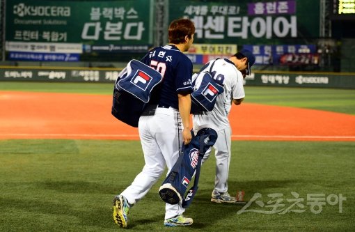 9일 오후 서울 목동야구장에서 열린 2013프로야구 넥센과 두산의 준플레이오프 2차전에서 넥센 타자 김지수가 연장 10회말 1사 3루 타석에서 끝내기 안타로 승부를 끝냈다. 경기종료 후 두산 김현수가 그라운드를 빠져나가고 있다.