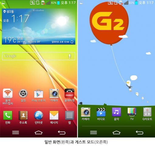 LG G2 사용자라면 ‘게스트 모드’를 이용해 보는 것이 어떨까. 게스트 모드란, 스마트폰을 2개의 모드로 사용할 수 있는 기능이다. 게스트 모드를 이용하면 사생활 침해 우려가 있는 앱(카카오톡, 이메일, 통화 기록, 갤러리 등)이 보이지 않도록 설정할 수 있다. 이를 통해 사생활을 보호하고, 상대방의 기분도 상하지 않게 할 수 있다.