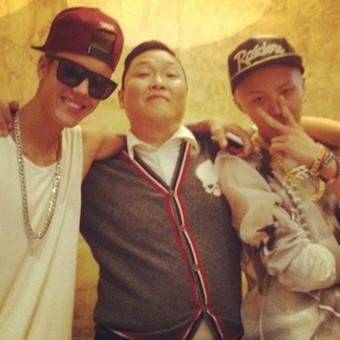 사진에는 저스틴 비버가 싸이, 지드래곤과 함께 다정하게 포즈를 취하고 있는 모습이 담겨 있다.