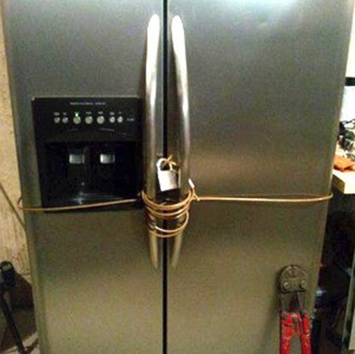 사진에는 양문형 냉장고 손잡이를 밧줄로 꽁꽁 감아 자물쇠를 채워놨다. 이는 마치 냉장고를 절대 열지 않고 다이어트를 하겠다는 의지가 담겨 있는 것으로 보인다.