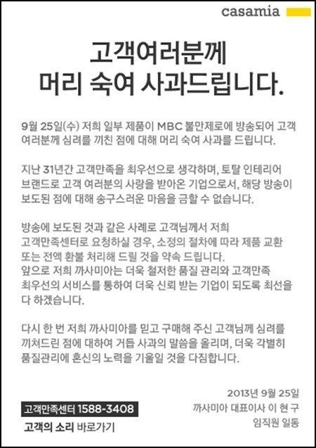 이후 까사미아는 전액 환불 및 교환 처리를 약속했으나 보증기간이 지난 제품에 대해서는 소극적인 태도를 보이고 있다.