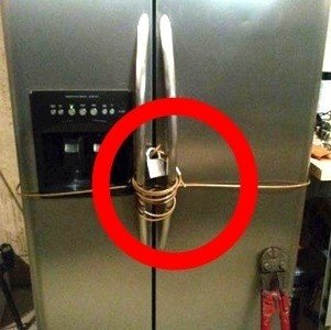 냉장고 문을 여는 것을 어렵게 만들어 먹는 음식의 양을 줄여 반드시 다이어트에 성공하겠다는 굳은 의지가 느껴진다.