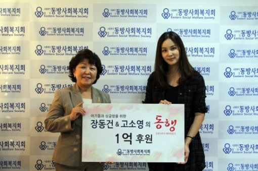 고소영은 10일 오후 서울 서대문구 창천동에 위치한 동방사회복지회를 방문해 기부금 1억원 전달식을 가졌다. 이 돈은 동방사회복지회의 입양대기아동과 싱글맘들 위해 쓰일 예정이다.
