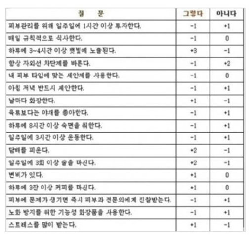 최근 한 온라인 커뮤니티 게시판에 ‘내 피부 나이’라는 제목의 자가 진단표가 게재됐다.