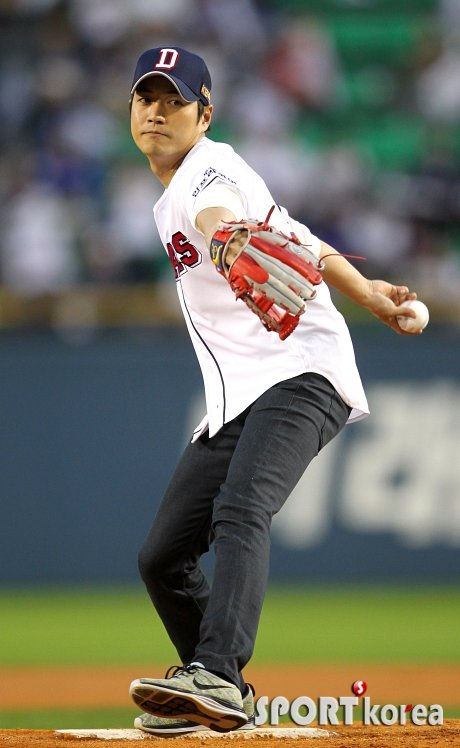 11일 오후 서울 잠실구장에서 열린 ‘2013 한국야쿠르트 세븐 프로야구’ 두산 베어스와 넥센 히어로즈의 준플레이오프 3차전에서 탤런트 주상욱이 시구하고 있다.