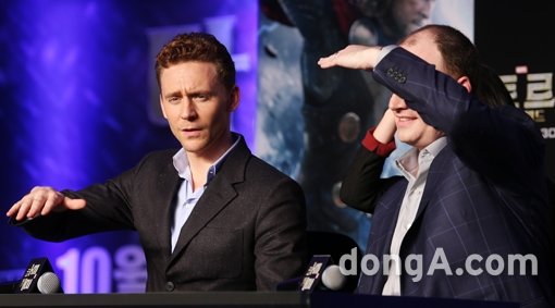 할리우드 배우 톰 히들스턴(왼쪽)과 제작자 케빈 파이기가 14일 오전 서울 여의도 콘래드호텔에서 열린 영화 ‘토르: 다크월드’ 공식 기자회견에서 취재진의 질문을 듣고 있다.