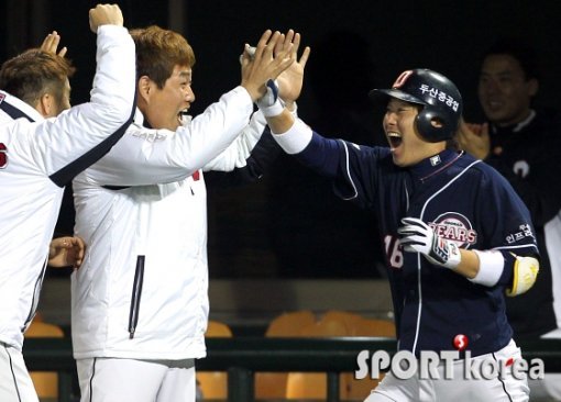 14일 오후 서울 목동구장에서 열린 ‘2013 한국야쿠르트 세븐 프로야구’ 넥센 히어로즈와 두산 베어스의 준플레이오프 5차전에서 두산 6번 이원석이 4회초 1사 1,2루에서 비거리 115미터 좌월 스리런홈런을 치고 홈인한 뒤 덕아웃에서 양의지 등 동료선수들과 환호하고 있다.