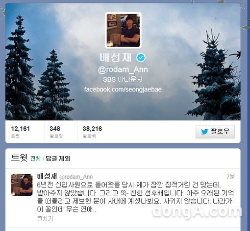 배성재 아나운서는 16일 자신의 트위터에 “6년전 신입사원으로 들어왔을 당시 제가 잠깐 집적거린 건 맞는데, 받아주지 않았습니다”라며 “그리고 쭉- 친한 선후배입니다. 아주 오래된 기억을 떠올리고 제보한 분이 사내에 계셨나봐요. 사귀지 않습니다. 나라가 이 꼴인데 무슨 연애…”이라는 글을 올렸다.