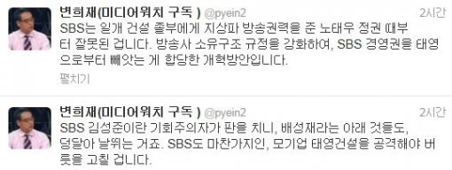 변희재 대표는 이날 자신의 트위터에 “SBS 김성준이란 기회주의자가 판을 치니, 배성재라는 아래 것들도, 덩달아 날뛰는 것”이라며 “SBS도 마찬가지인, 모기업 태영건설을 공격해야 버릇을 고칠 것”이라고 글을 게재했다.