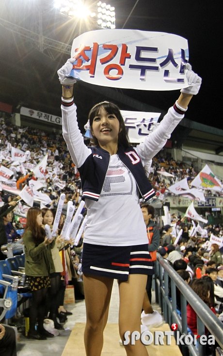 16일 오후 서울 잠실구장에서 열린 ‘2013 한국야쿠르트 세븐 프로야구’ LG 트윈스와 두산 베어스의 플레이오프 1차전에서 두산의 치어리더가 응원전을 펼치고 있다.