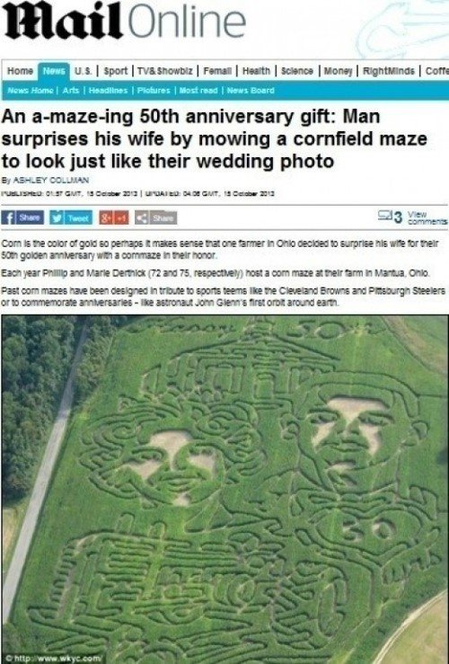 지난 15일(현지시각) 데이리메일은 “미국 오하이오주 만투아의 한 농부가 자신의 부인을 위한 결혼기념 선물로 옥수수 밭에 결혼 사진을 그렸다”고 소개했다.
