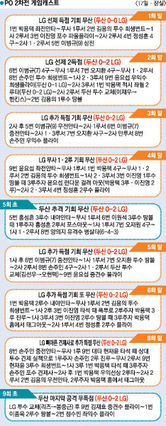 LG는 17일 플레이오프(PO) 2차전에서 선발 리즈의 호투 속에 승리를 챙겼지만, 공격만 놓고 보면 잔루도 많고 홈에서 3번이나 횡사하는 등 아쉬운 모습도 수차례 보였다. 그러나 한 가지 명확한 것은 1차전보다 전반적으로 나아졌다는 점이다. 두산은 패하긴 했지만 불펜투수들이 어려운 환경 속에서 무실점으로 버텼다는 점이 수확이라고 할 수 있다. 양 팀이 1·2차전을 한 게임씩 나눠 가지면서 진짜 승부는 3차전부터 펼쳐지게 됐다.