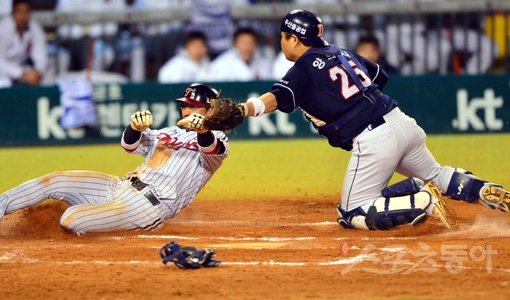 주자보다 공이 빨랐다. LG 박용택(왼쪽)이 17일 잠실에서 열린 PO 2차전 6회말 1사 3루서 이진영의 2루수 땅볼 때 홈으로 쇄도했지만, 두산 포수 양의지에게 태그아웃 당하고 있다. 잠실|박화용 기자 inphoto@donga.com 트위터 @seven7sola