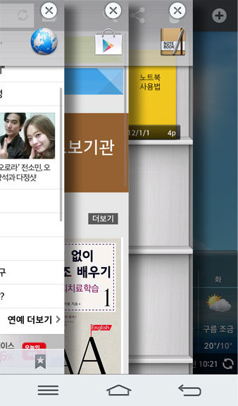 LG G2 사용자라면 원하는 앱들을 골라 한 눈에 확인, 보다 편리하게 멀티태스킹 작업을 할 수 있는 ‘태스크 슬라이더’ 기능을 이용할 수 있다. 태스크 슬라이더는 앱 화면을 밀어 놓았다가 필요할 때 다시 꺼내서 쓸 수 있는 기능이다. 참고로 태스크 슬라이더로 저장한 앱들은 홈 버튼을 길게 눌렀을 때 나타나는 '모두 지우기' 버튼을 눌러도 그대로 남아 있다.
