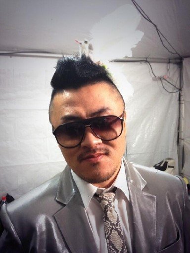사진 속 데프콘은 뱀무늬 넥타이에 광이 나는 은색 자켓을 입고 카메라를 응시하고 있다. 특히 데프콘의 머리 위에 놓인 비둘기 인형이 눈길을 끈다.