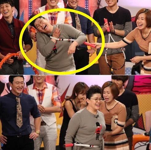 이영자는 박미선의 도움을 받아 가까스로 가슴 부분은 통과했으나 복부에서 완전히 걸려 이도저도 못하는 상황에 처하고 말았다. 이영자는 결국 몸을 빼내지 못해 녹화를 중단하고 응급처치를 받아야 했다.